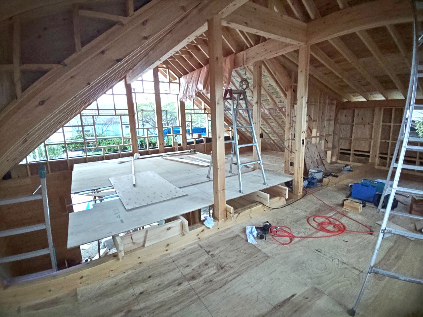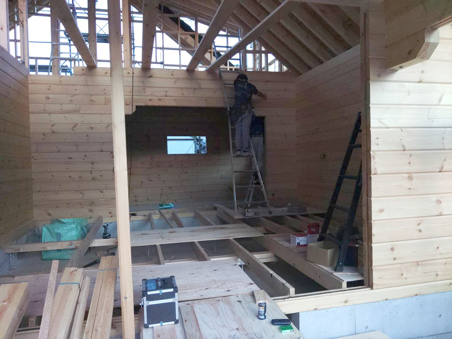 お知らせログハウス現場だより現場いろいろ社長ブログ 滋賀県 O邸 母屋新築工事 施工状況2 #お知らせ #ログハウス現場だより 屋根工事はルーフィング張りが完了し、屋根葺き工事開始です 2階は外部の合板張り、断熱材入れを進めています 1階は根太設置中です 前のページへ 一覧へ戻る