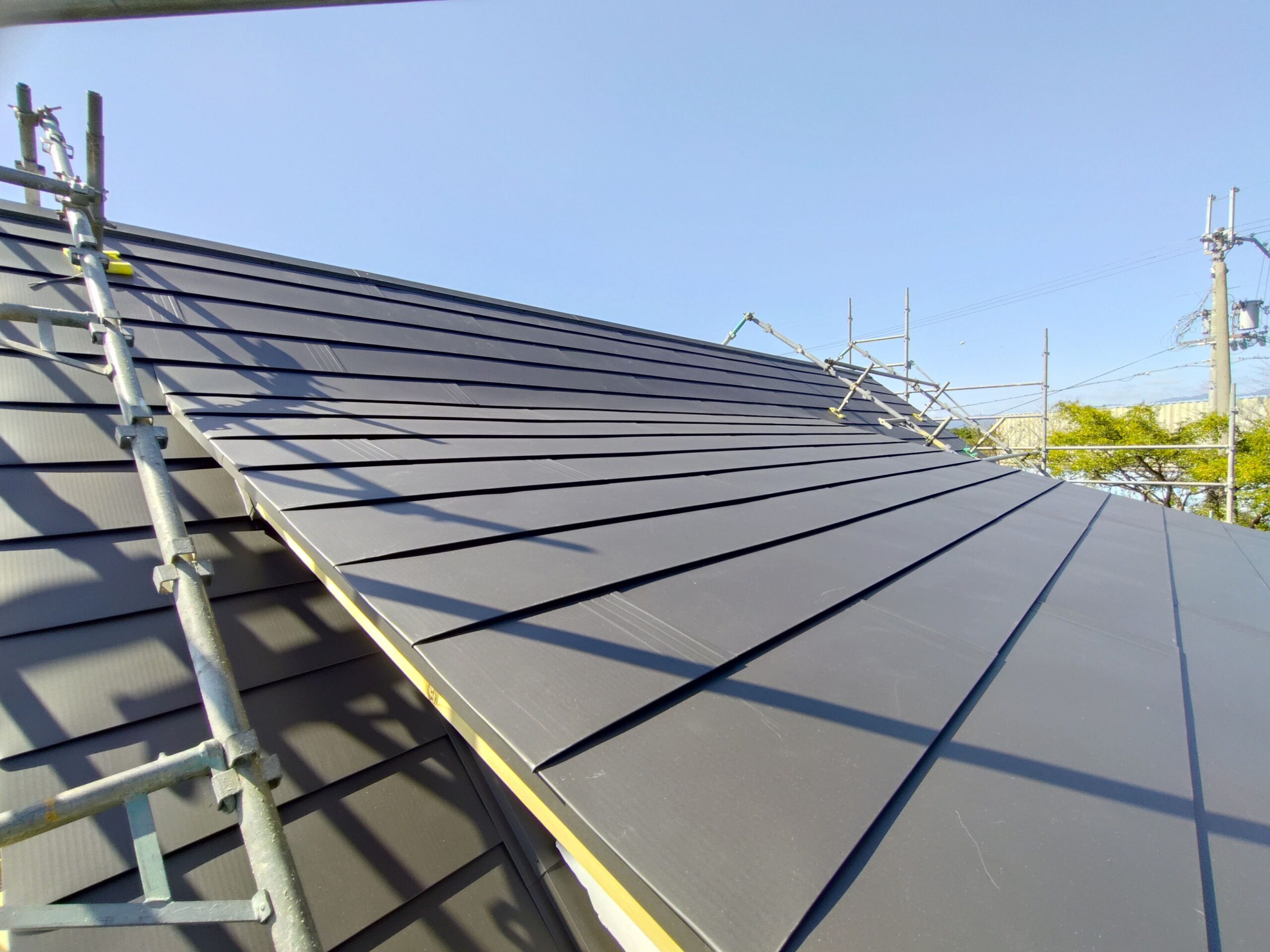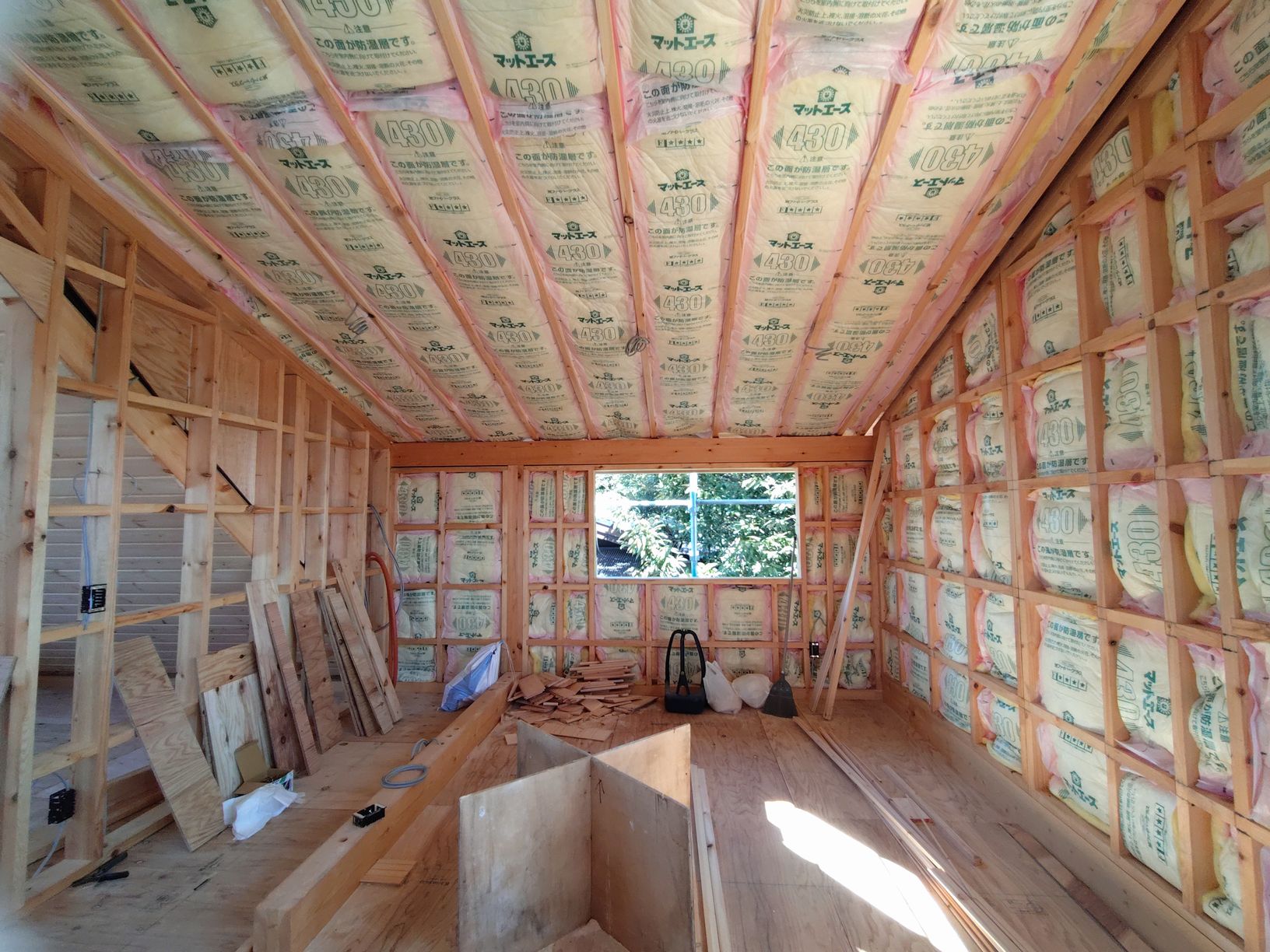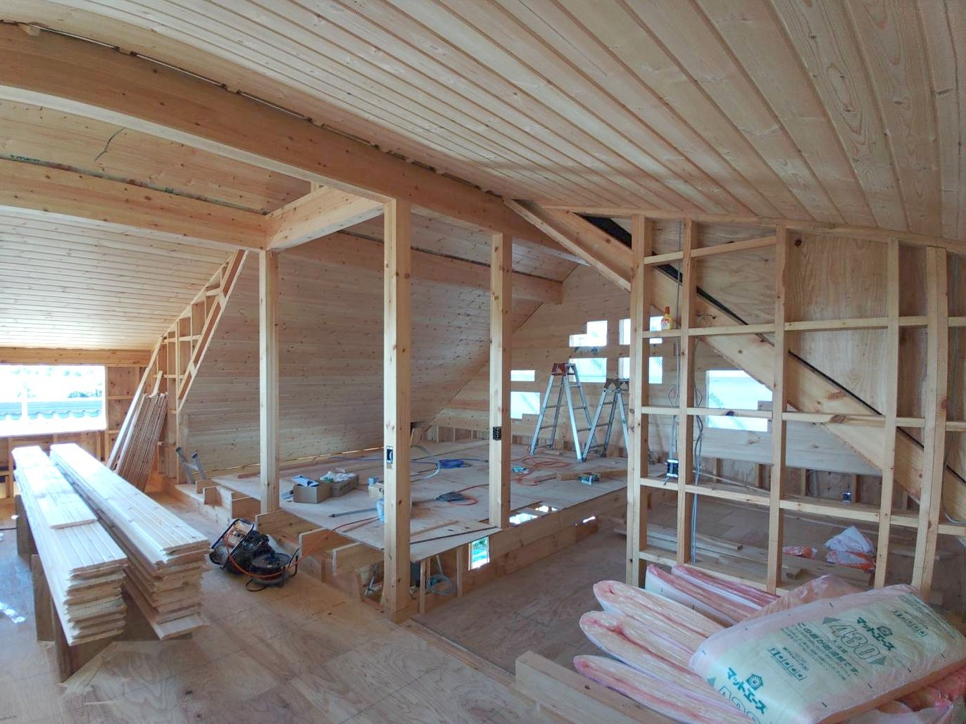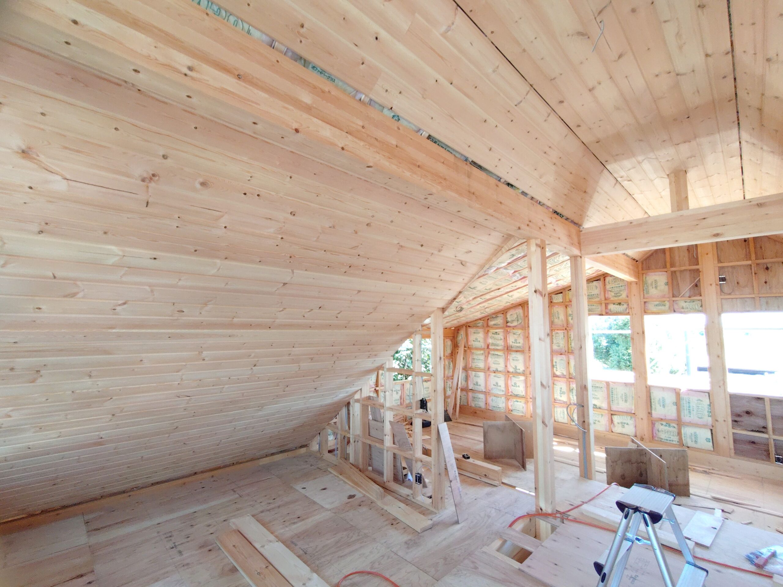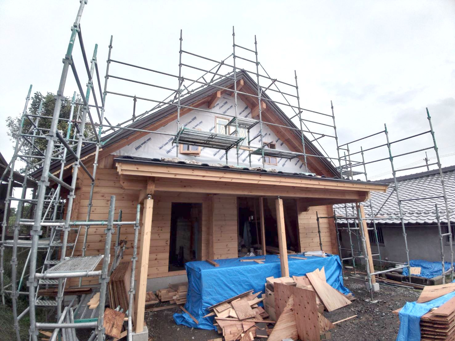 お知らせログハウス現場だより現場いろいろ社長ブログ 滋賀県 O邸 母屋新築工事 施工状況3 #お知らせ #ログハウス現場だより 妻壁にステンドグラス窓が入りました 2階から仕上げていっています 屋根葺き工事は完了 ガリバニウム鋼板 いぶし銀カラーです 前のページへ 一覧へ戻る