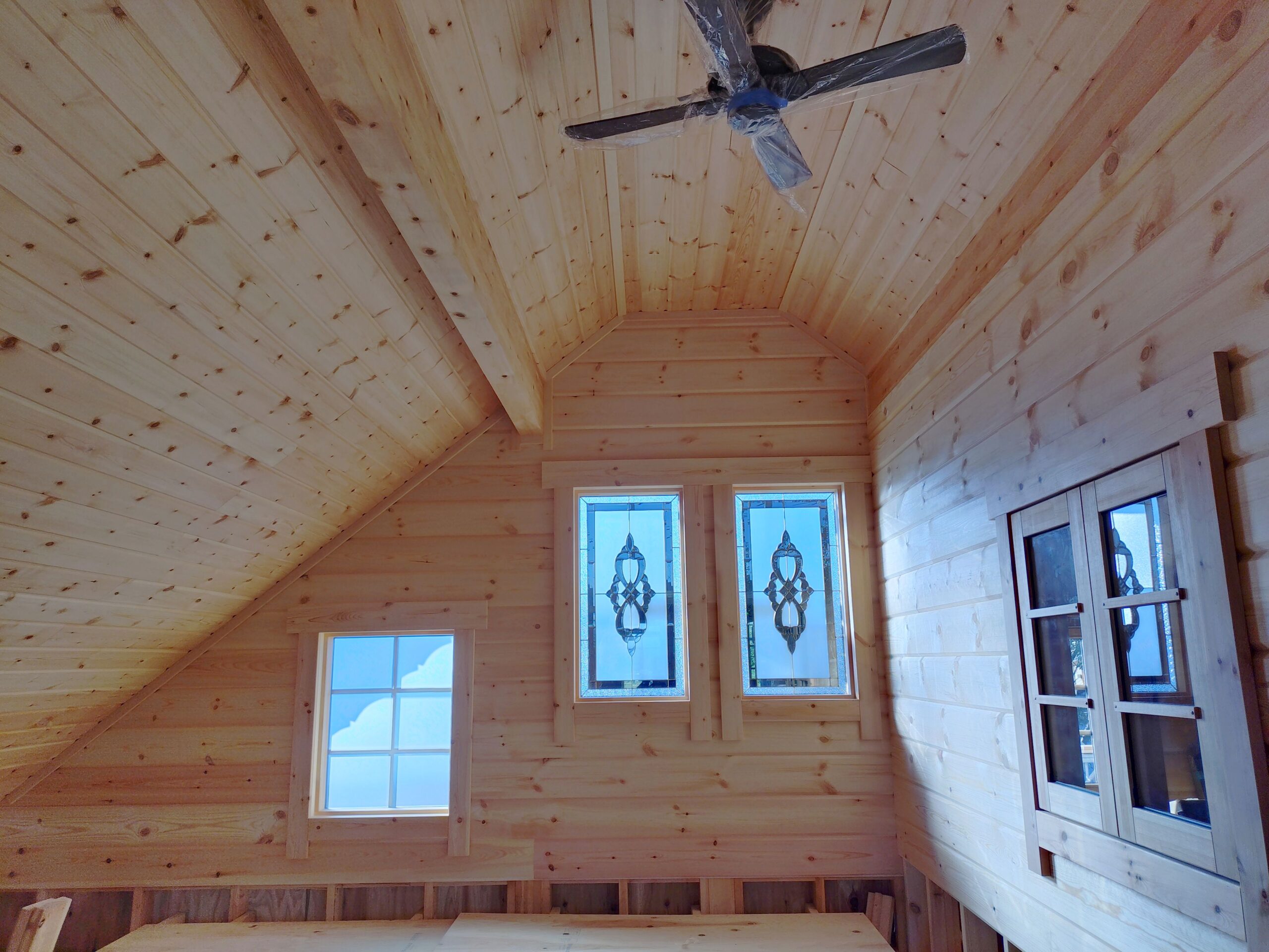天井板・壁のログパネル・床板を一枚一枚張って仕上げています